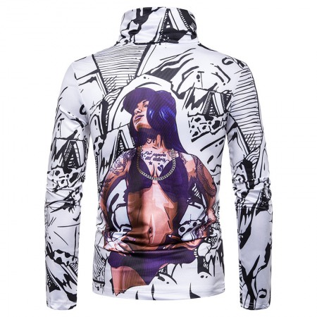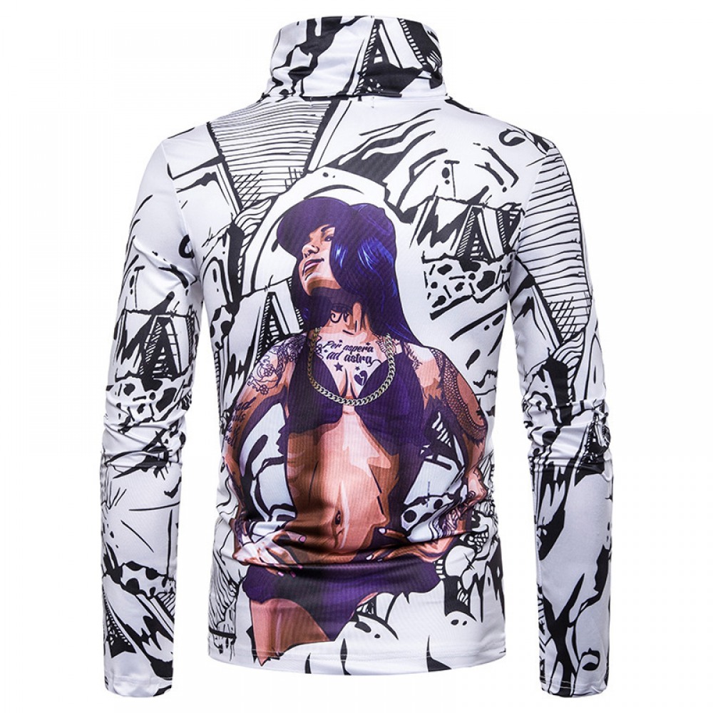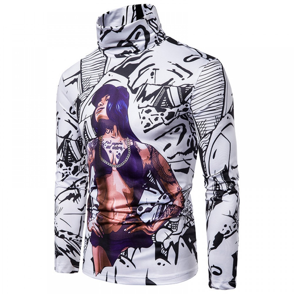 New Men's Large Size 3D Muscle Girl Print High Neck Long Sleeve T-Shirt Base Shirt