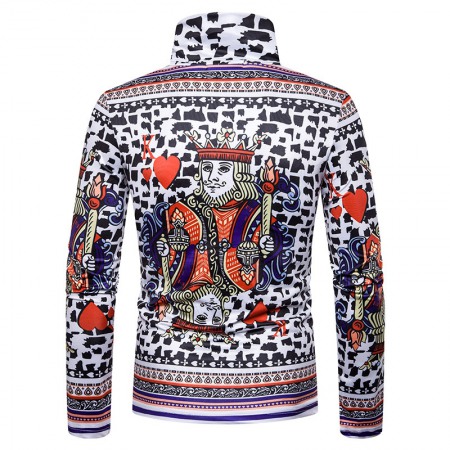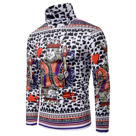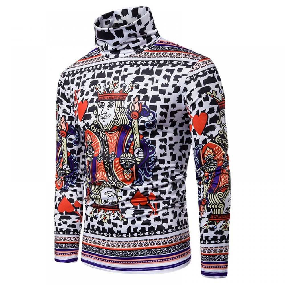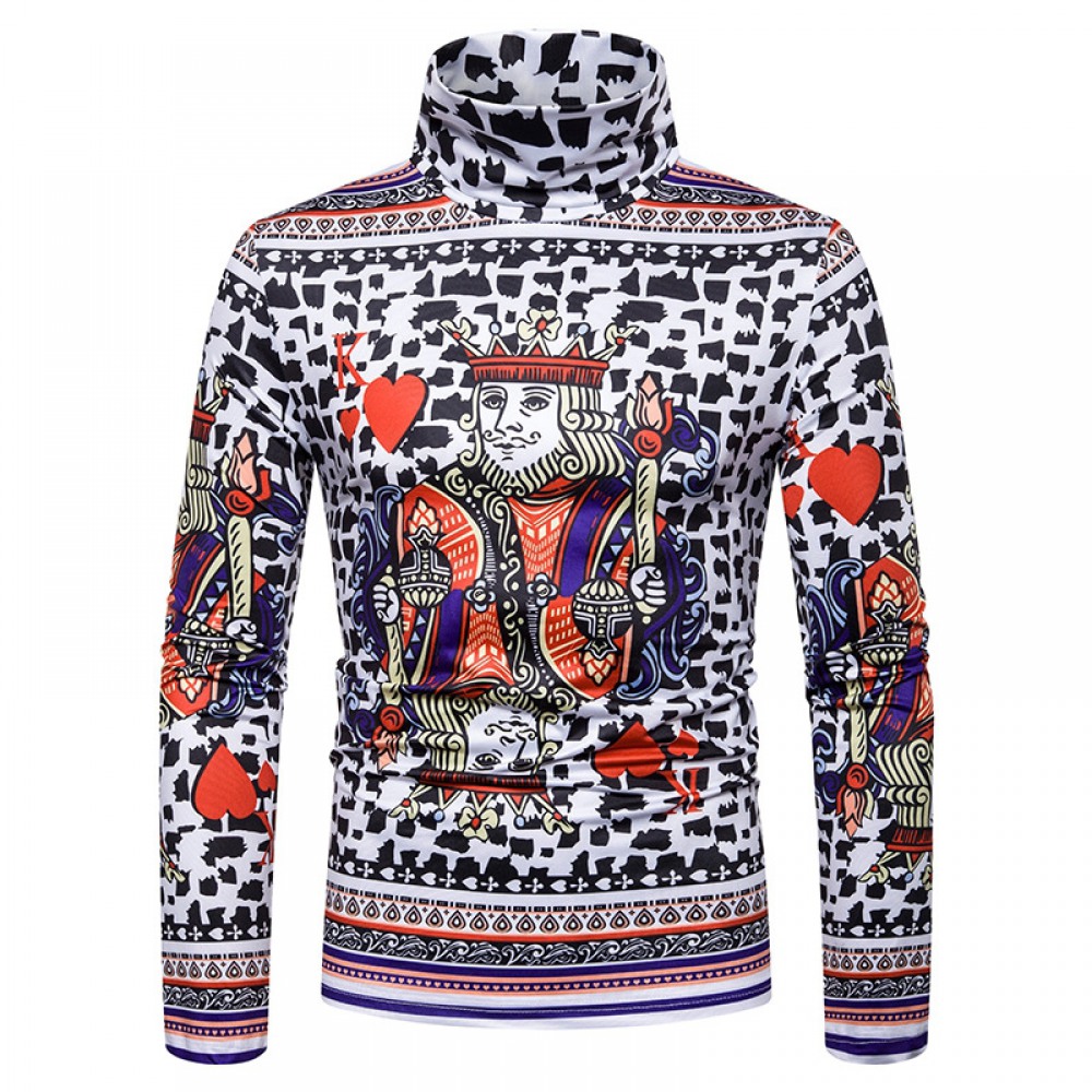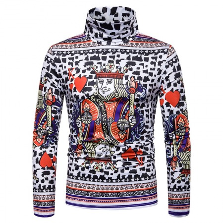 New Men's Large Size 3D Retro Playing Cards Floral Print High Neck Long Sleeve T-Shirt Bottoming Shirt