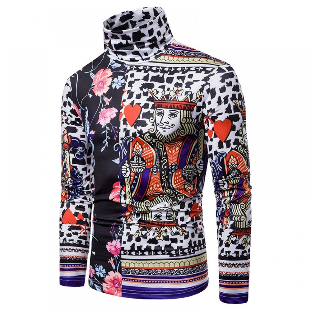 New Men's Large Size 3D Retro Playing Cards Floral Print High Neck Long Sleeve T-Shirt Bottoming Shirt