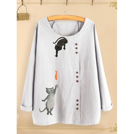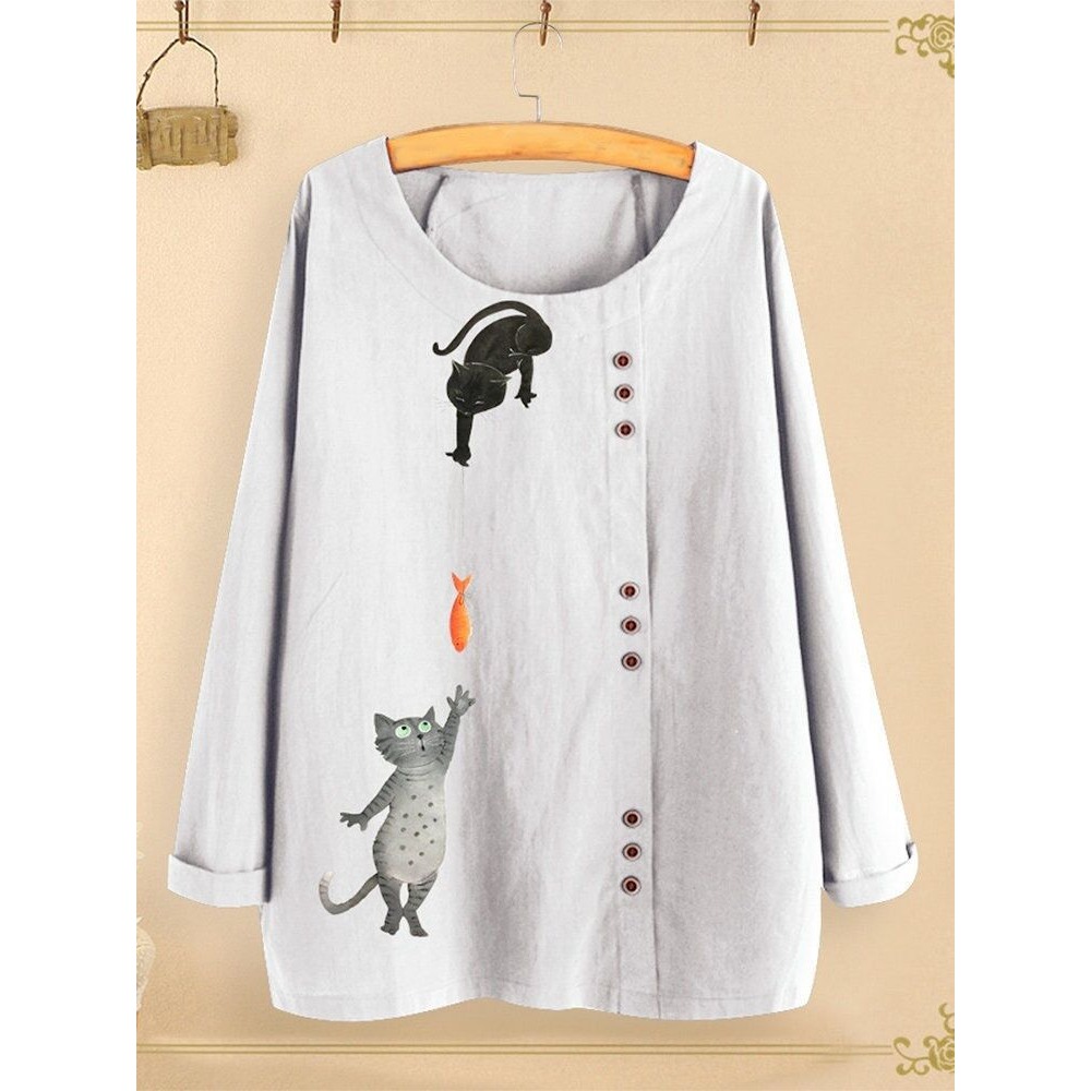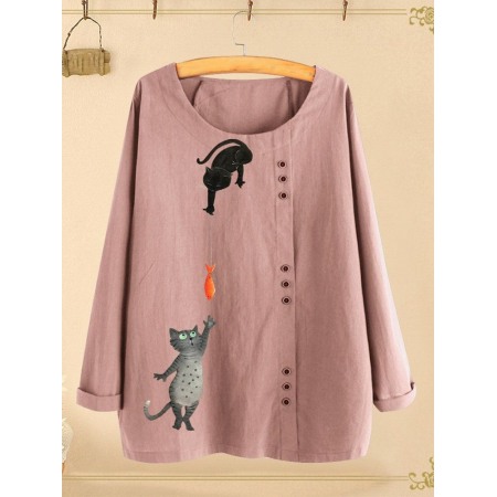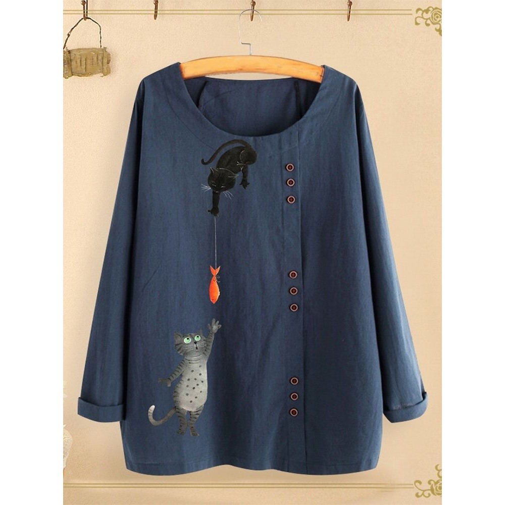 New Style Cotton and Linen Printed T-Shirt Round Neck Long Sleeve Women's Loose Printed Top