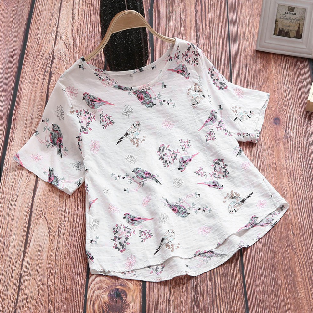 Retro Cotton and Linen Printed Short-Sleeved Casual Loose T-Shirt Women