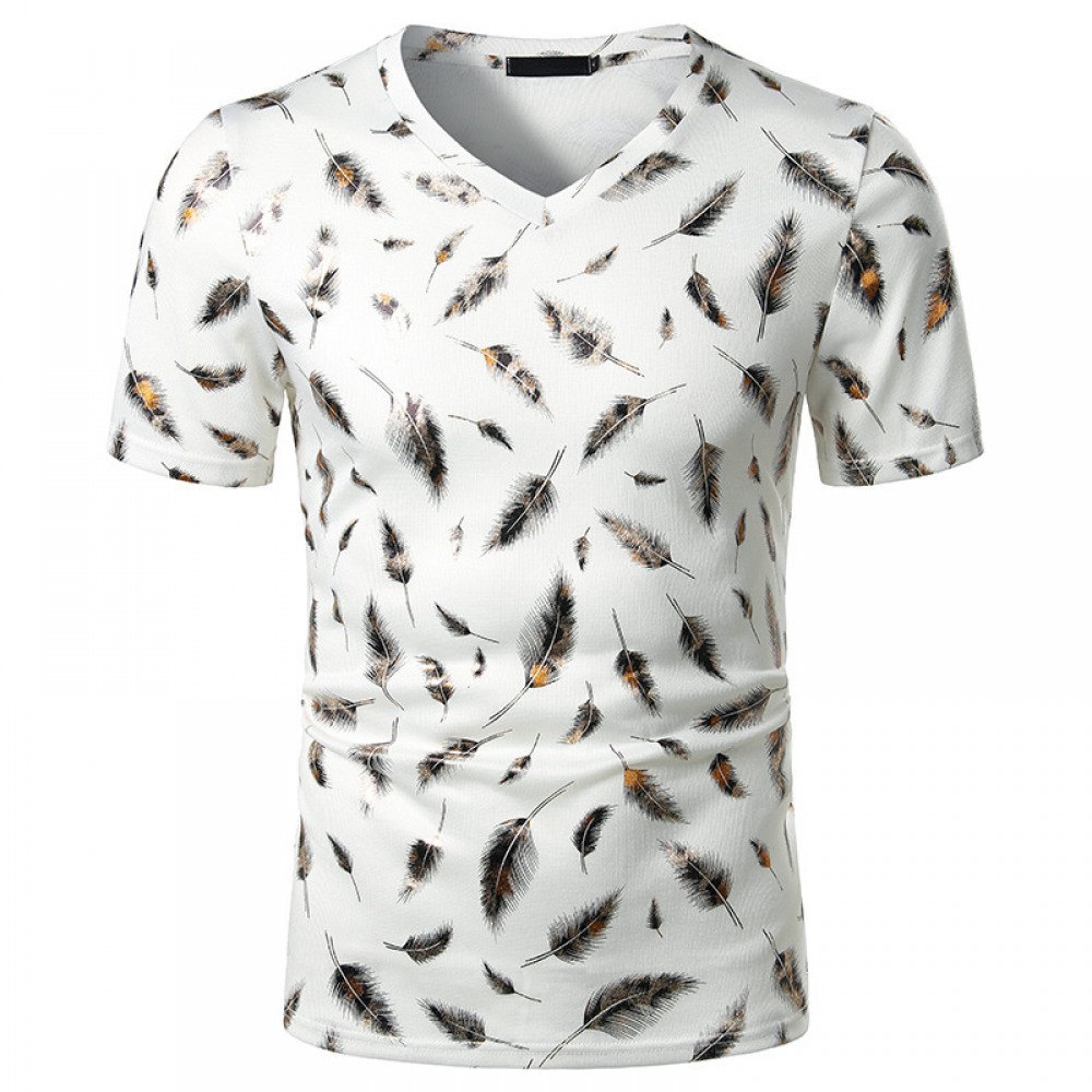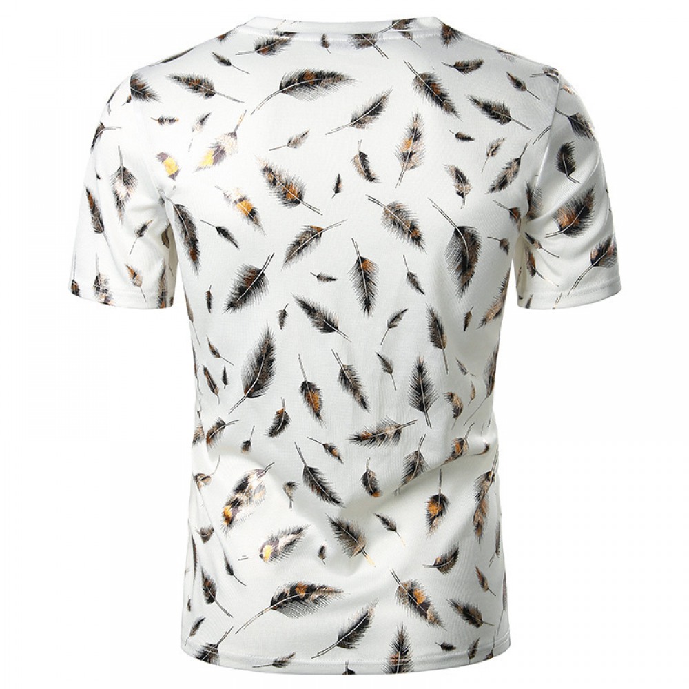 Summer Men's Nightclub Bar Fashion Casual Feather Print Short-Sleeved T-Shirt